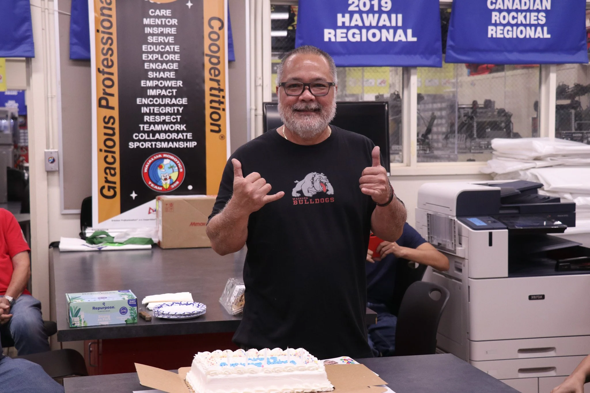 We’re halfway through week 3 and day nineteen of the build season! The Control Systems subteam, like the day before, were not as busy as the other subteams, but they did prepare more devices for the main season robot. The Construction subteam busied themselves with continuing to CAD minor adjustments to the robot, milling, lathing, deburring, cutting, waterjetting, measuring, and laser cutting more of the adjustment robot parts. They also worked on the main season robot on the side. The Business, Media, and Documentation subteam continued to take pictures and video clips, updating the website, and more practice on their First Impact Award presentation. The day is coming to an end, and we wish a very happy birthday to a mentor of our team, Mr. Lunasco! Our team celebrated with a cake, singing him a happy birthday!